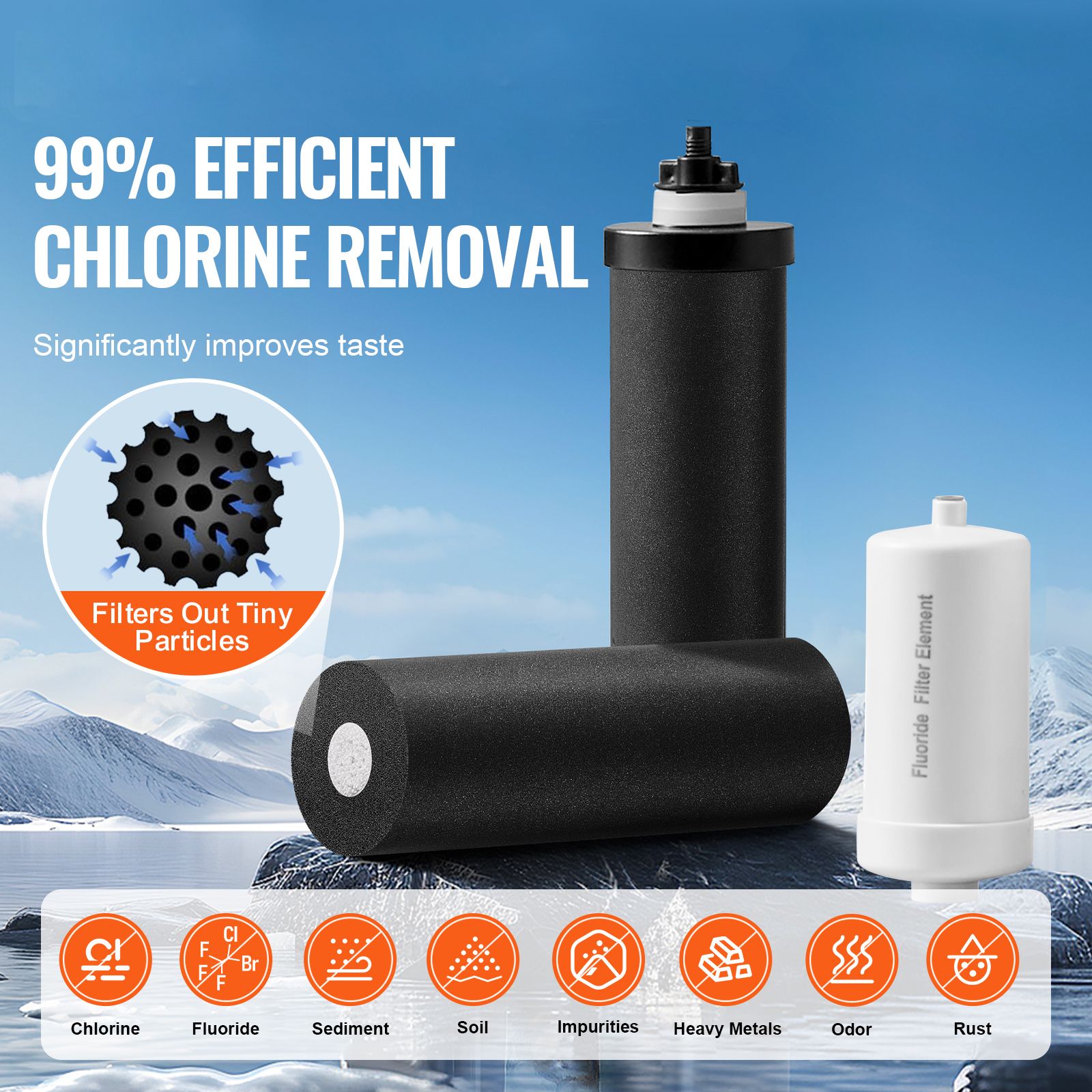 1.Efficient Filtration: The gravity-fed water filter system use activated carbon + fluoride filter as the filter medium, removing 99% of chlorine, and some fluorides from water and improving its taste. It also reduces heavy metals, sediments, rust, soil, and other impurities, ensuring clean and healthy water.