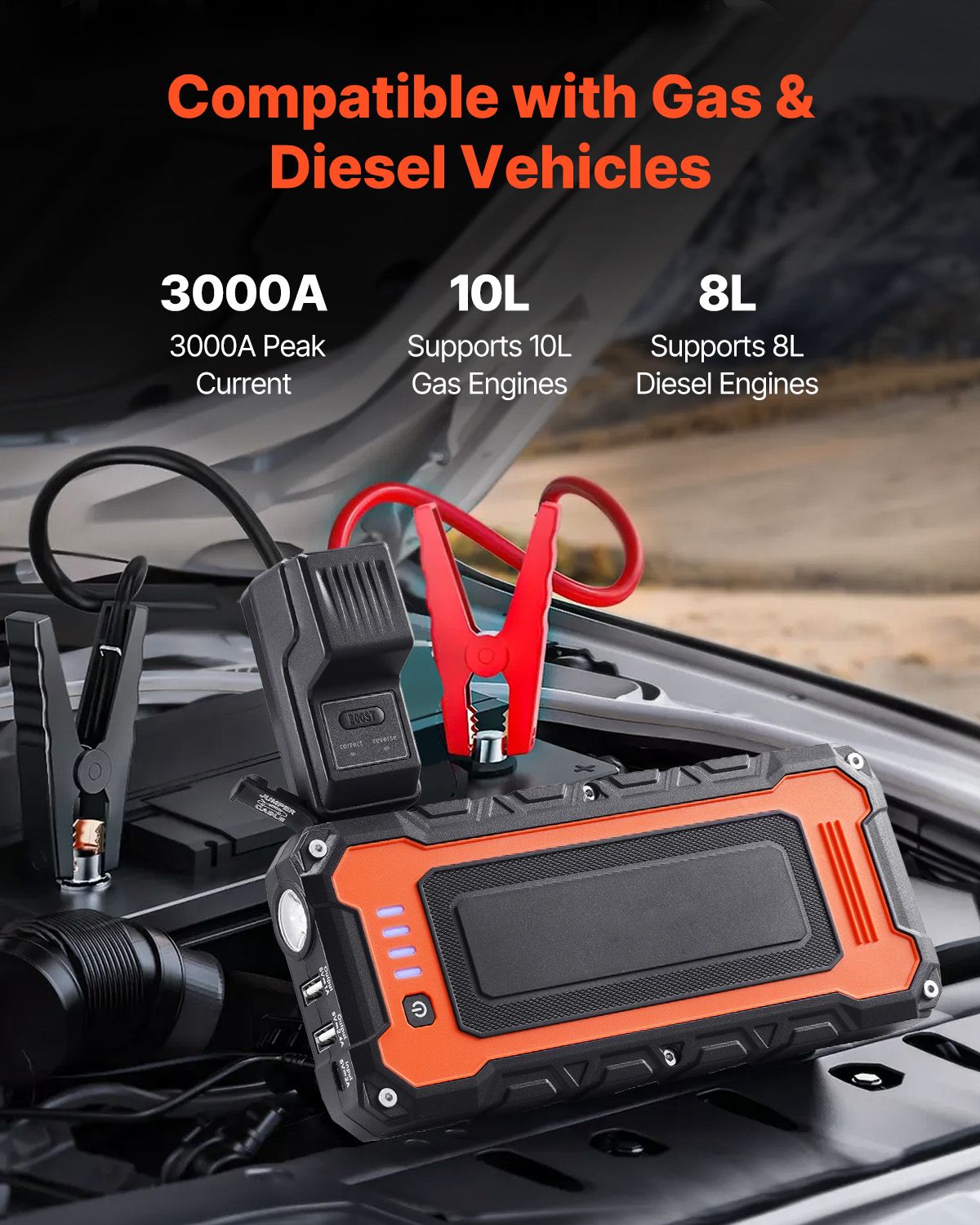 Our jump starter delivers a 3000A peak current and 59.2Wh battery for quickly starting heavy-duty vehicles. It's lightweight and features 10 intelligent protections. Moreover, its versatile LED light including flashlight, SOS, and strobe modes, makes it a reliable companion for outdoor emergencies.