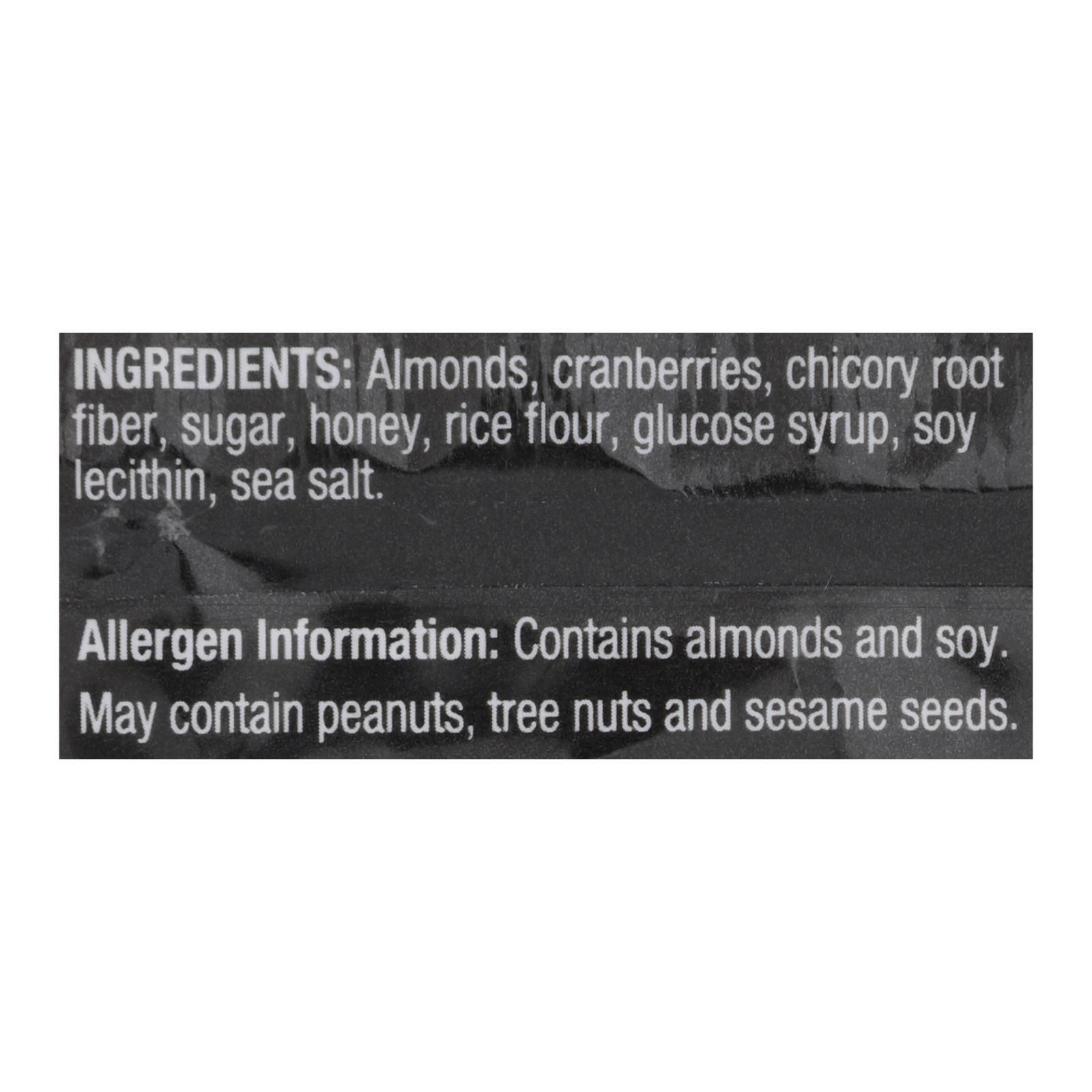 ingredients : almonds;cranberries;chicory root fiber;sugar;honey;rice flour;glucose syrup;soy lecithin;sea salt
