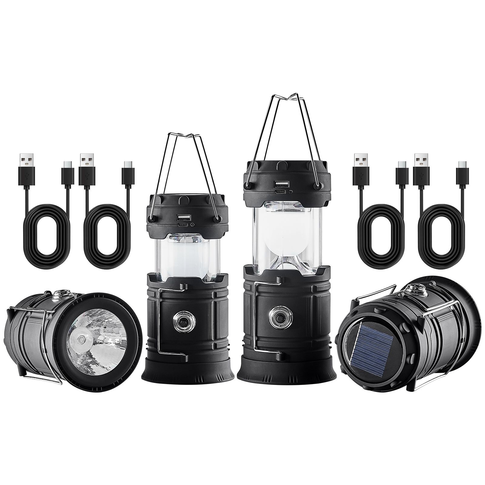 2.Versatile Charging Options: Our camping flashlight offers both solar and USB charging options, with a charging time of approximately 4-6 hours. It can be recharged at home or in your car, coming with 4 USB-C charging cables (0.5 m), offering excellent value whenever you are outdoor.