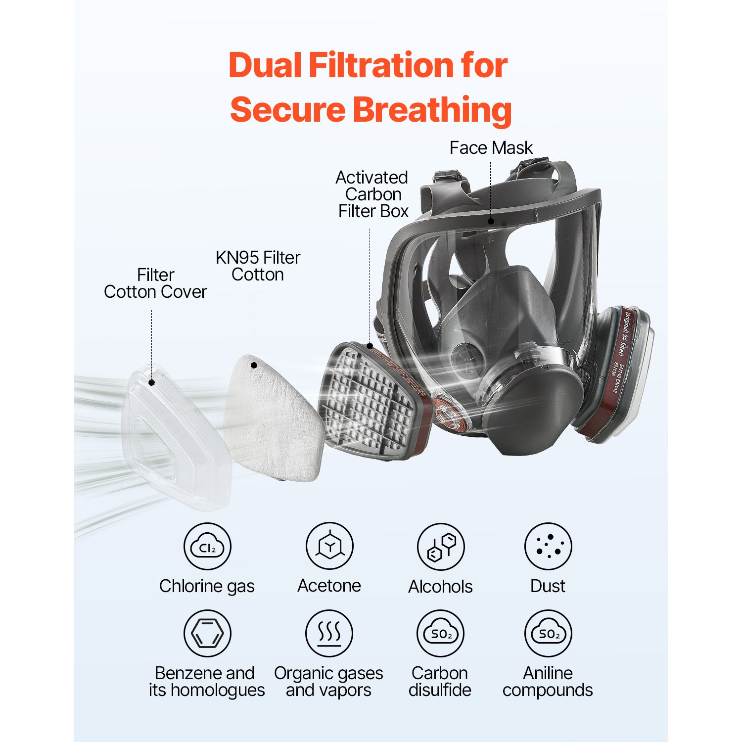 3.Clear Vision: This respirator mask with filters boasts a one-piece integrated protective lens that provides full-face coverage. The high-definition lens remains crystal clear-ensuring uninterrupted sight-while offering resistance to impact, splashes, and wind under various conditions