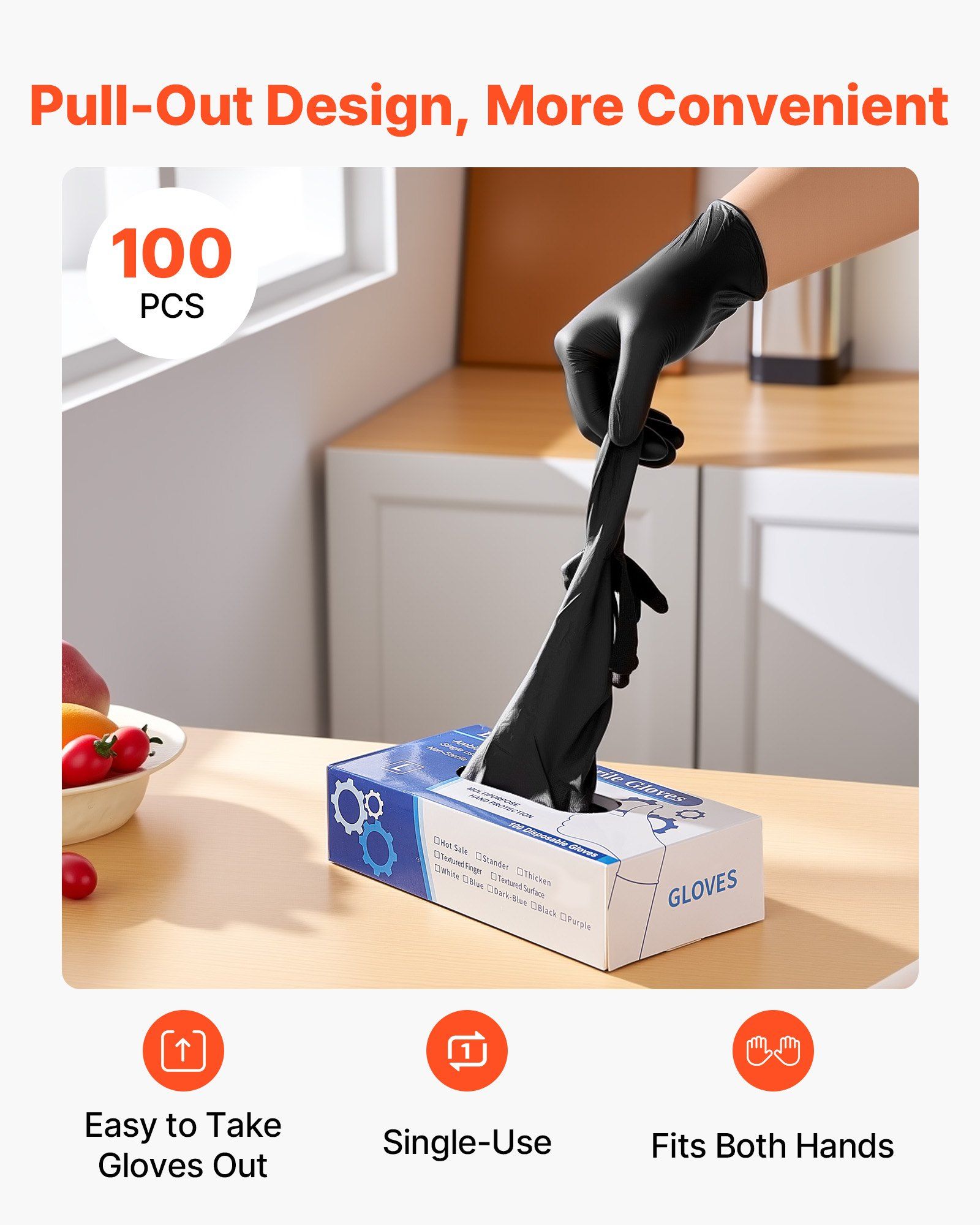 The black disposable gloves are packed in a convenient dispenser box with 100 gloves per box, keeping them organized and clean while making them easy to access.
